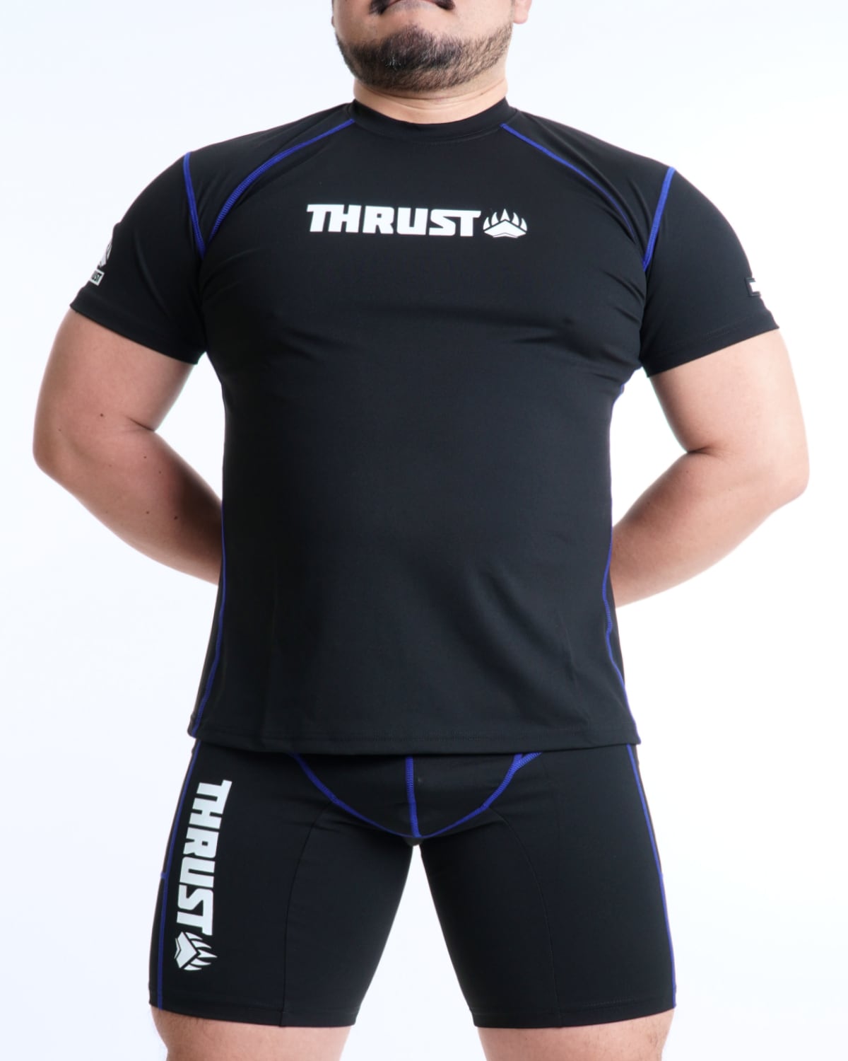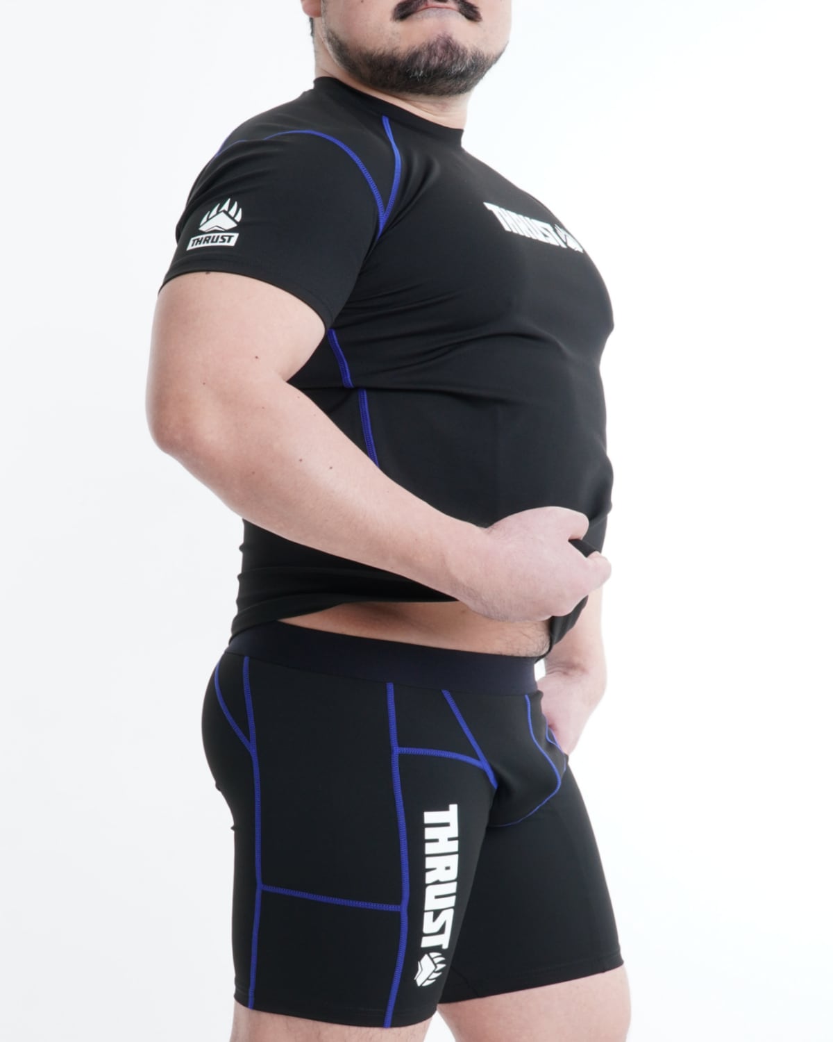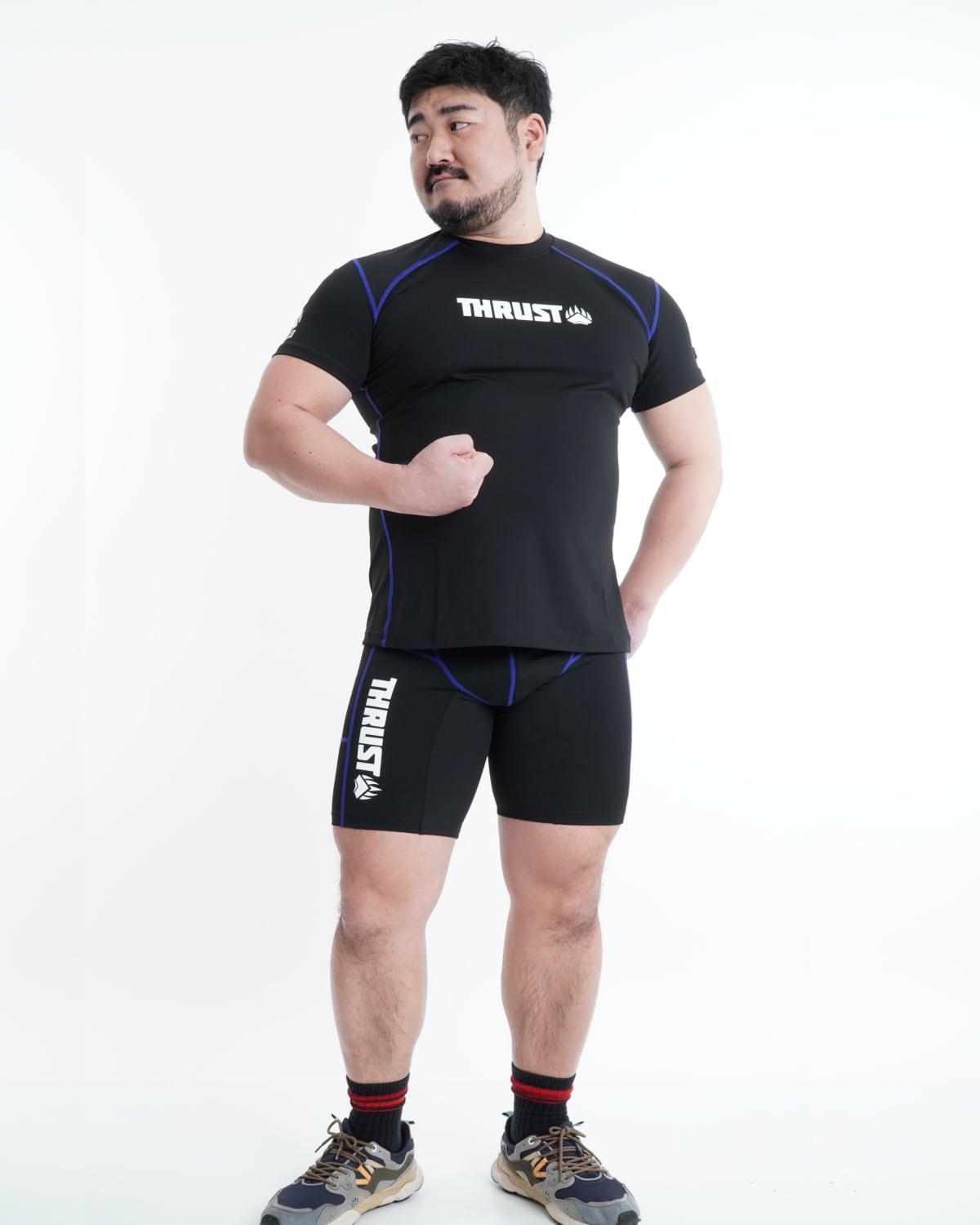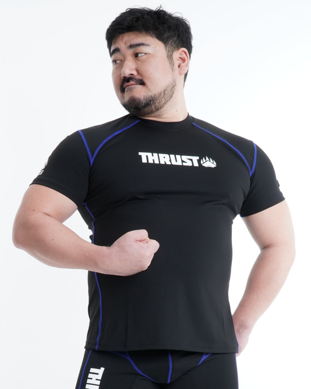 短めな袖丈、鍛えた身体をより大きく見せられる工夫もポイントです。